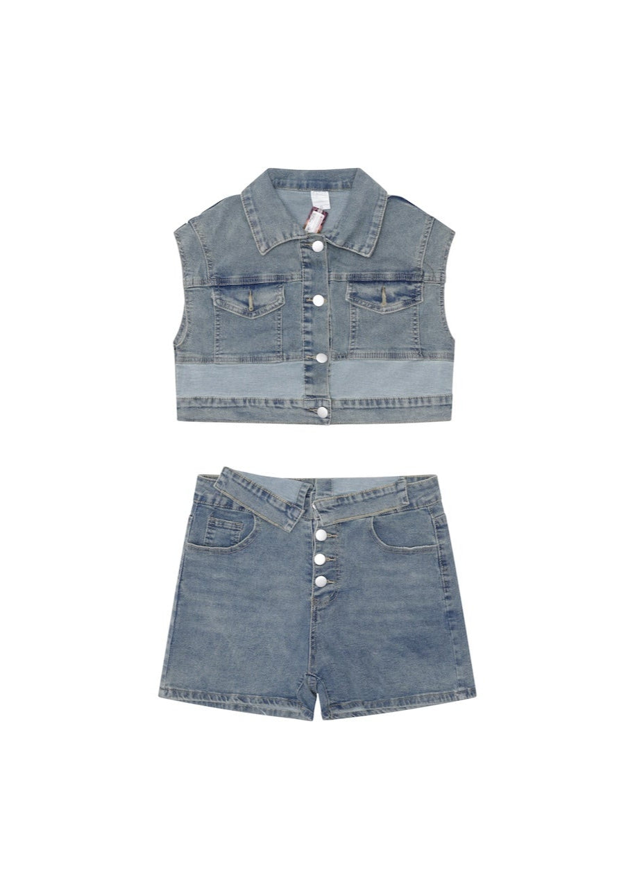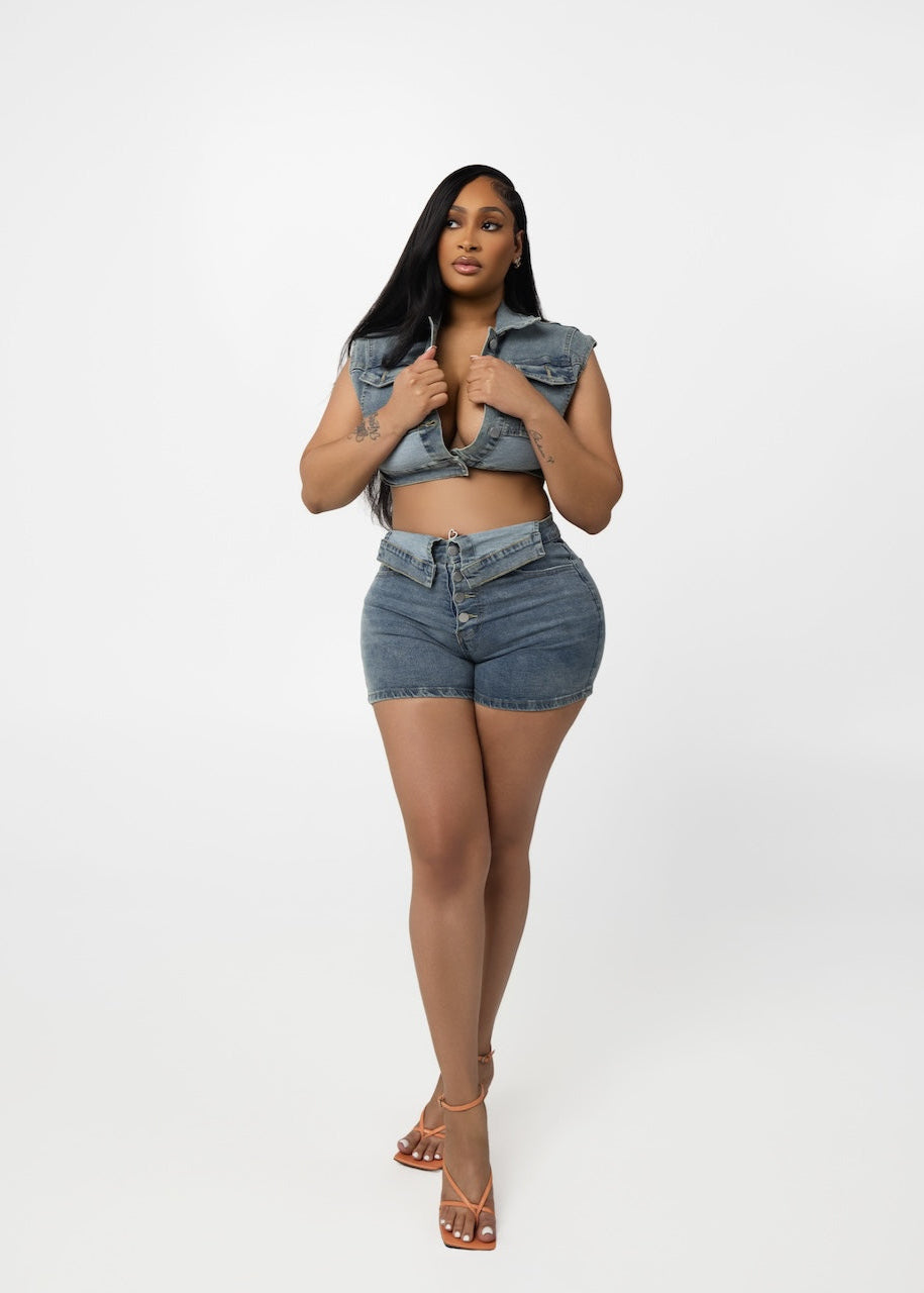 Matching shorts with vest like top. Shorts are stretch jean material.
